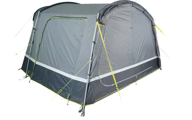 Eine Hochentlüftung belüftet das Zelt an regnerischen Tagen. Verschließbare, 50/50 teilbare Rückwand. Die gesamte Rückwand passt in die Easy Stow Away Tasche und es entfällt das lästige Aufrollen. Extra robuste Reißverschlüsse mit Regen-Abdeckung gegen Feuchtigkeit. 4 neongelbe, verstellbare Sturmbänder und Abspannleinen sind in der Dämmerung gut sichtbar. Kabeleingang mittels Reißverschluss und Kabelführung für Beleuchtung. Schleuse: Die Schleuse hat eine Dach-Befestigungslänge von 250 cm und eine verstellbare Anbauhöhe von 180-240 cm mittels Reißverschlusses und verstellbarem Gurtband. 2 Schleusentüren ermöglichen den Zugang zum Fahrzeug.